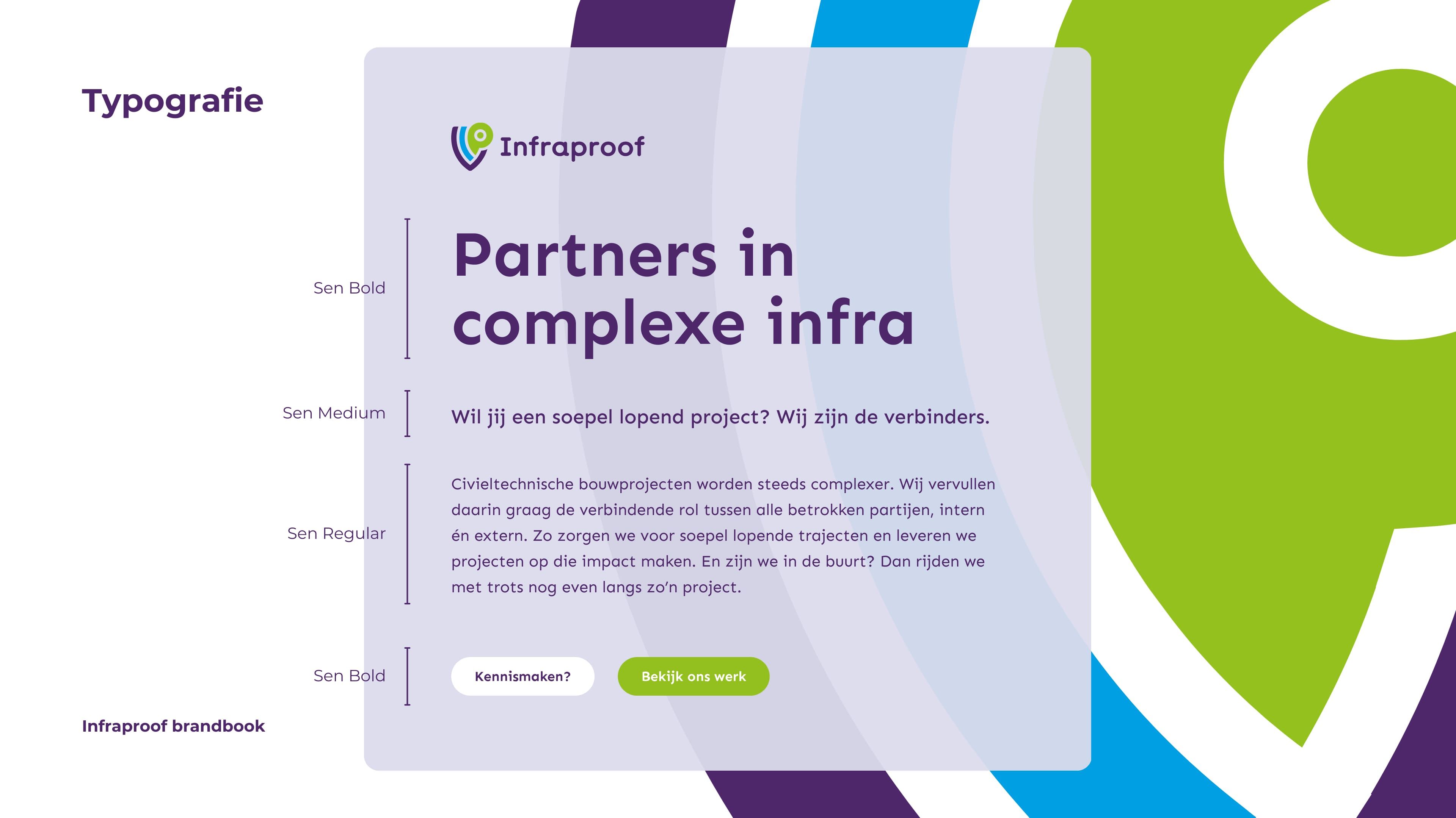 Een startend bedrijf heeft een logo nodig waar je ‘u’ tegen zegt. Eentje die blijft hangen op je netvlies, dankzij een helder design en een passend kleurenpalet. Blauw en groen staan symbool voor het werkveld en de rol die infrastructuur heeft in het landschap. Paars is de knipoog naar de kernwaarden innovatie en creativiteit. Infraproof zoekt immers naar slimme oplossingen - vaak buiten de gebaande paden om. Het logo heeft een element dat lijkt op een locatie- of markeringspunt. Hier valt alles samen: verbinding, complexiteit en technische kennis. De kleuren en beeldelementen uit het logo vind je ook terug in de site. Het geeft een krachtige en frisse look.